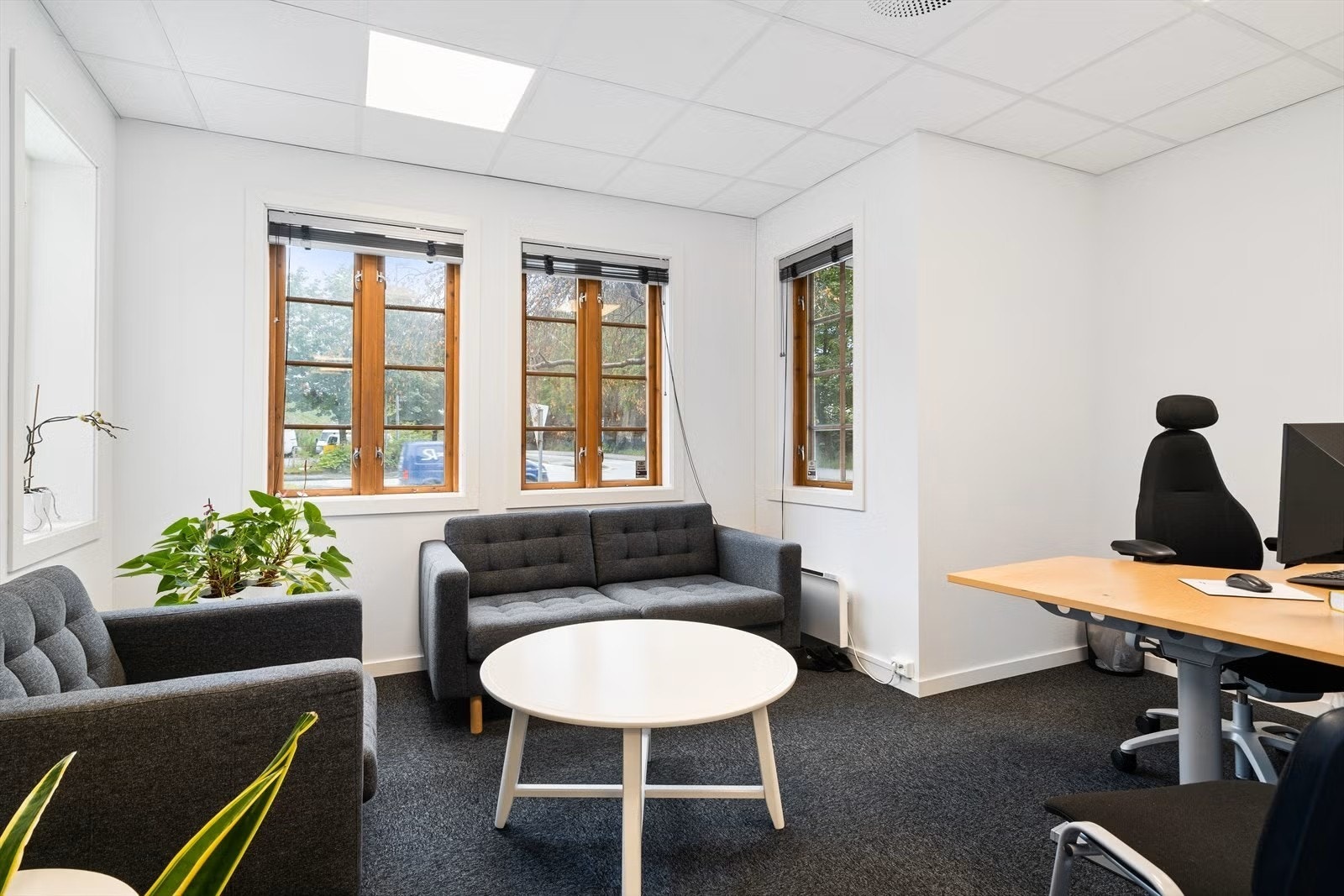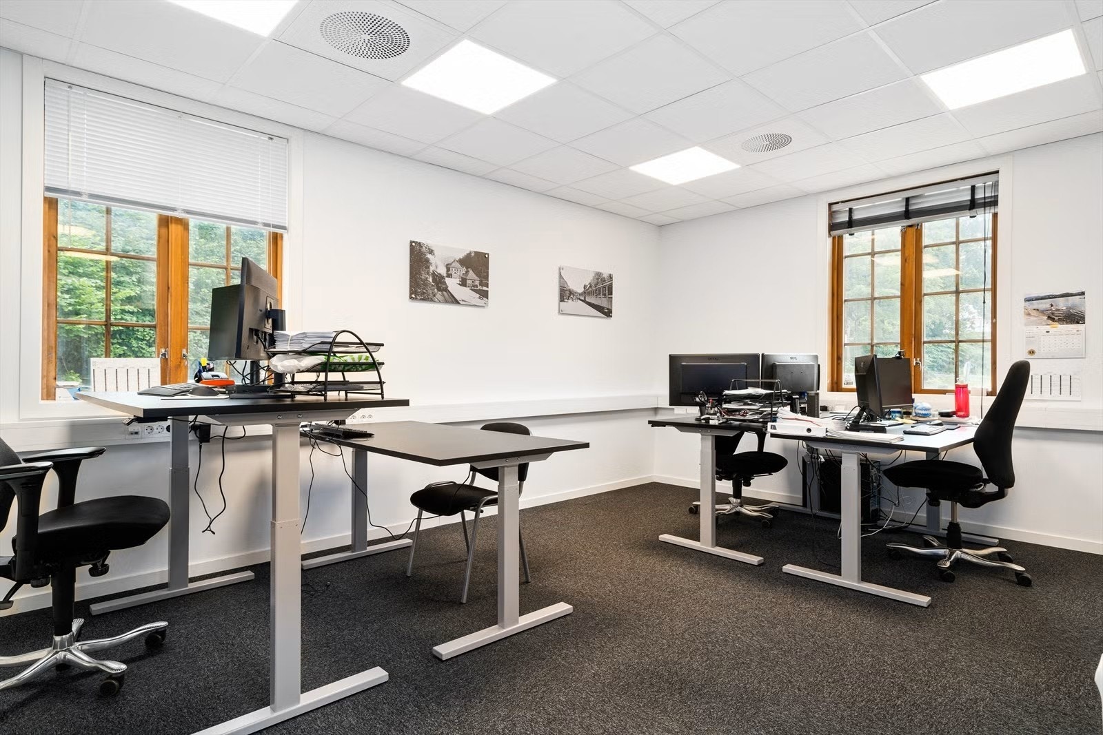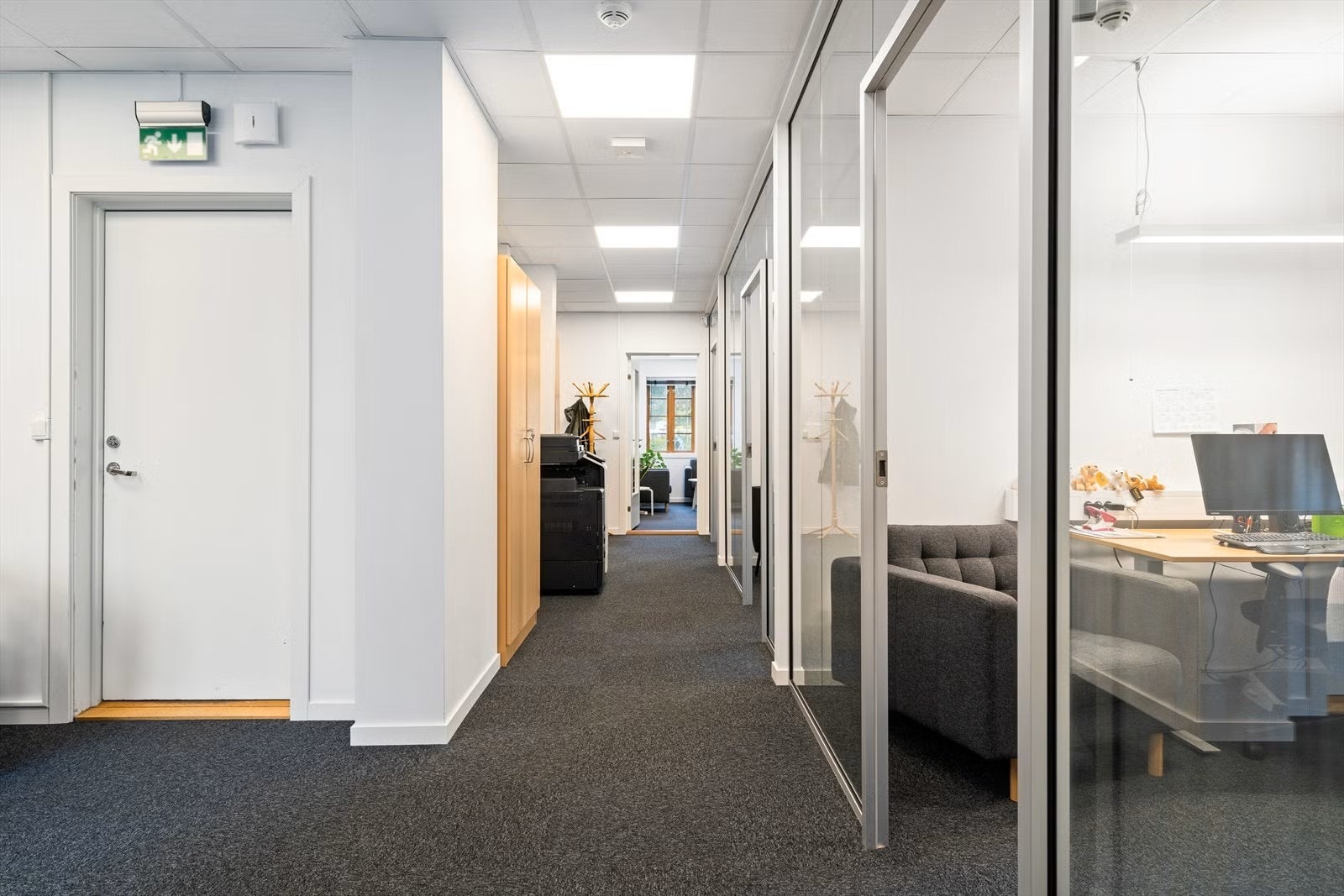 1.etasje: Entré og trappeareal, Gang- og fellesarealer, Kontorer, Spiserom, 2 stk. WC-rom.